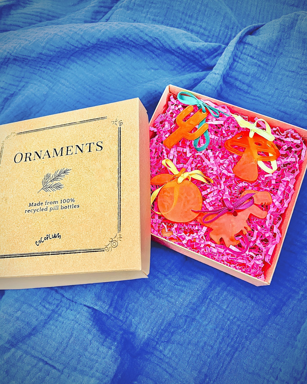 Deck the halls, sustainably. These merry little ornaments are made from 100% recycled pill bottles. Bright, durable, and full of character, they add a meaningful pop of color to your holiday season. Finished with ribbon made from 100% recycled polyester.